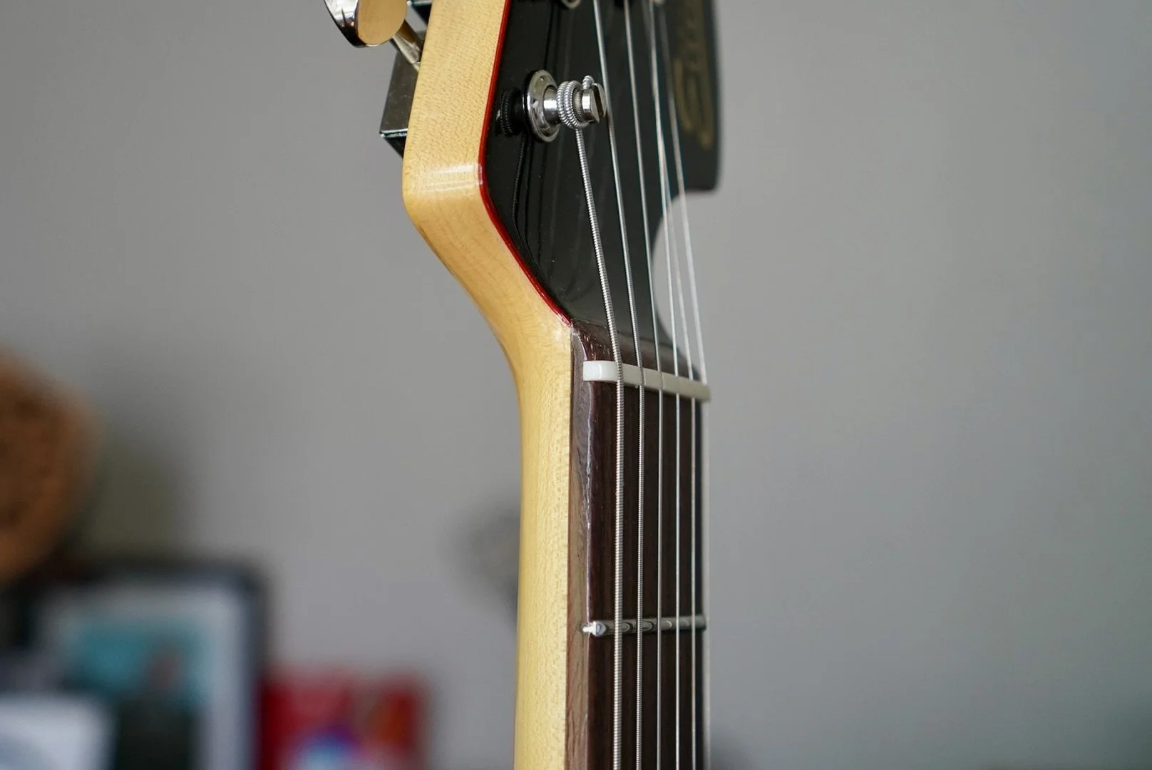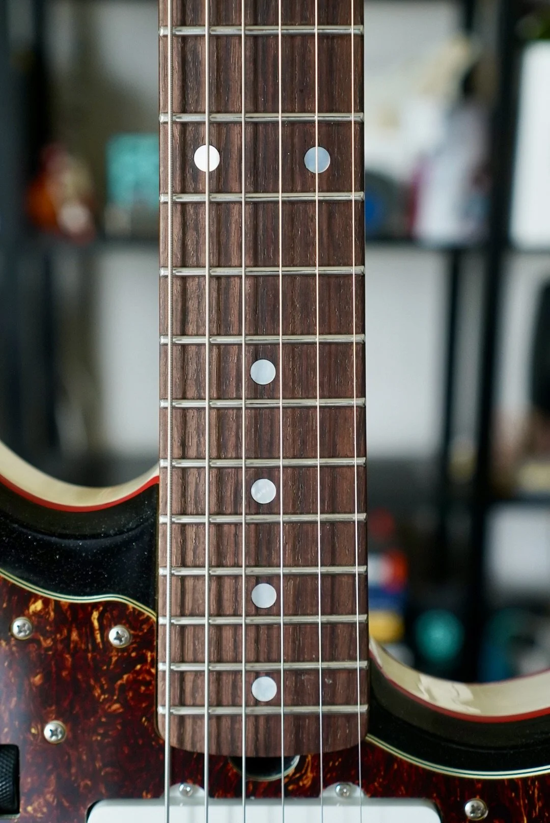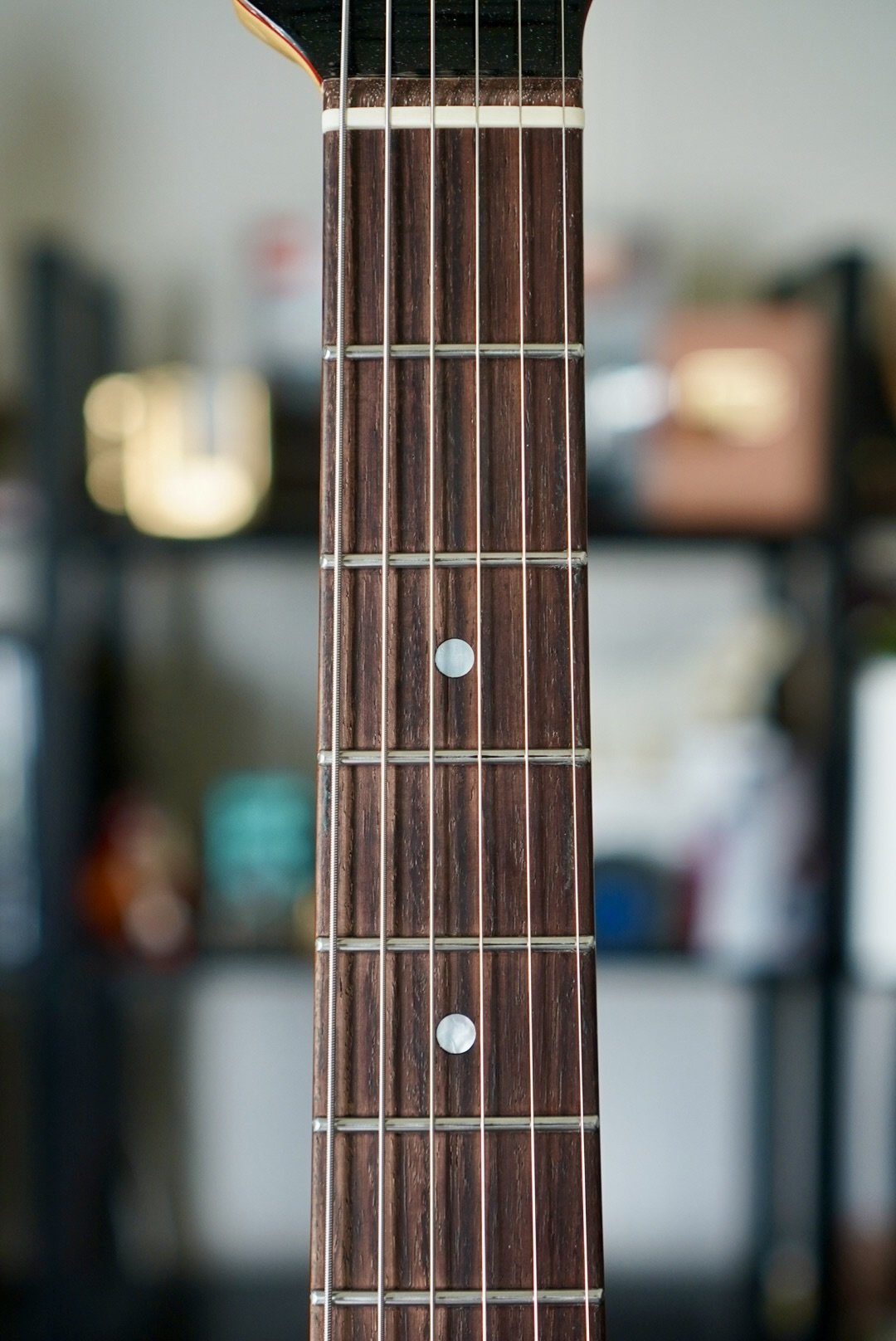 Action is low and fast and there is no real visible fret wear but lots of life left for sure. Electronics are smooth and quiet as a mouse!