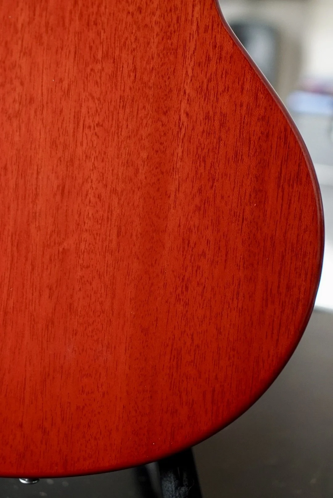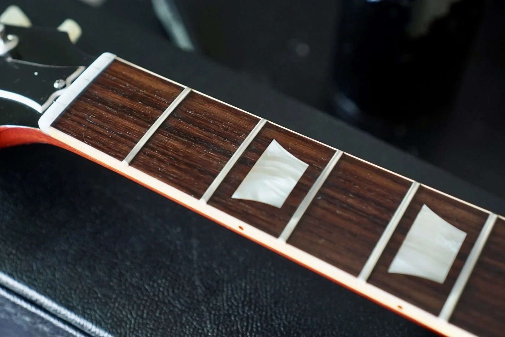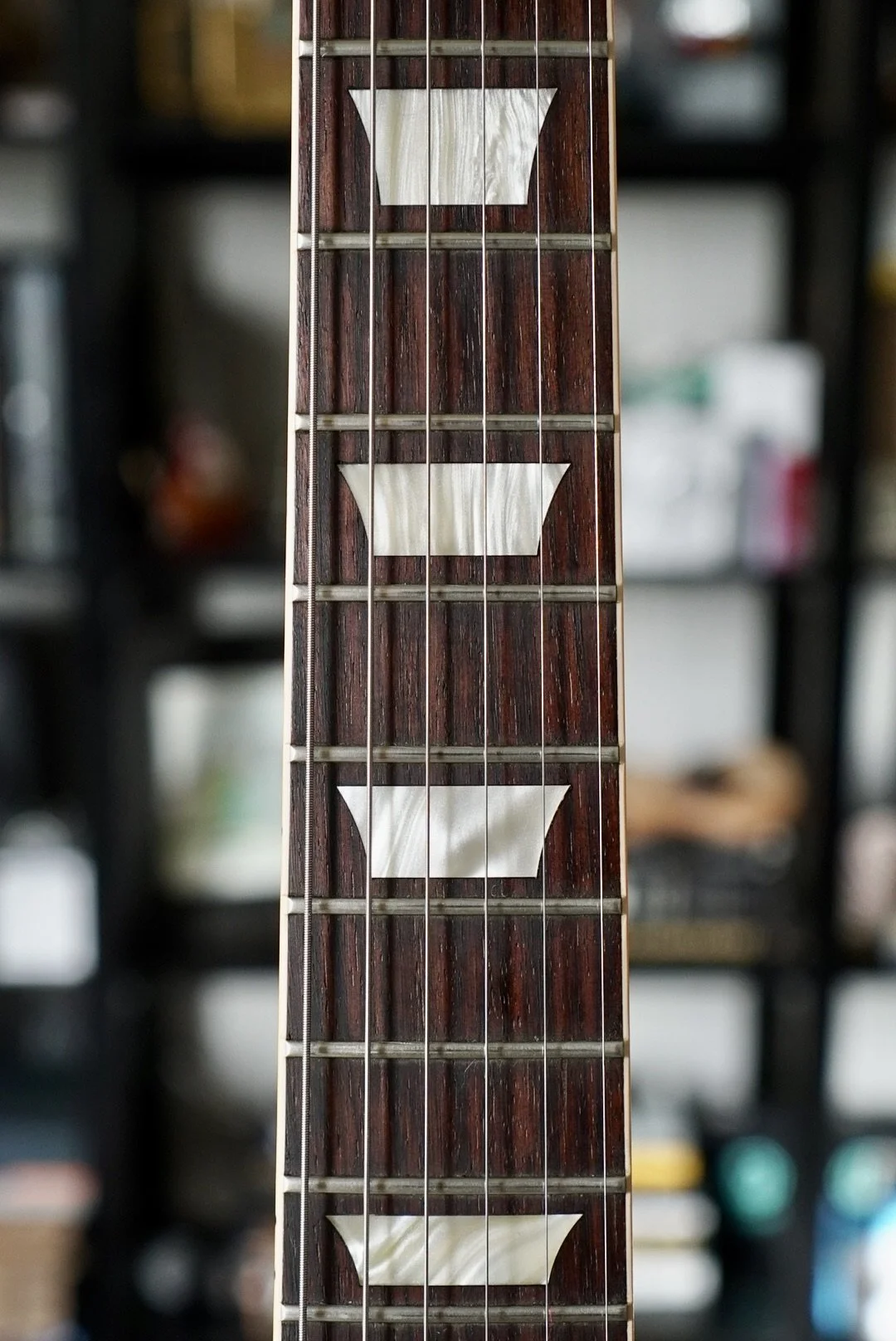 Frets have tons of life. Action is low and the neck is straight. She’s real fun to play all the way up the neck.