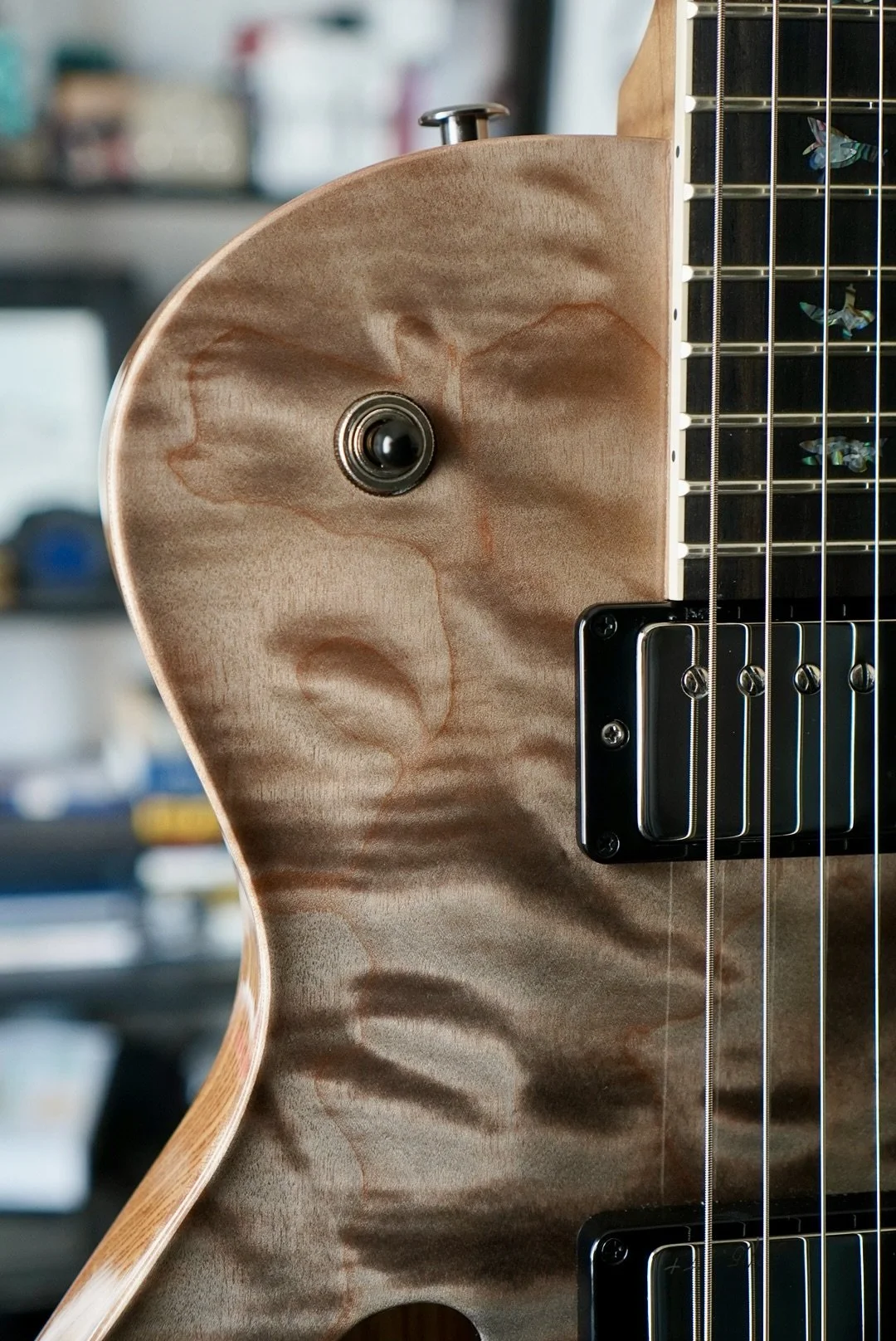 Absolutely stunning board Mother of Pearl Birds crown the Ebony board, but of course it’s all about that Flamed Roasted Maple Neck!