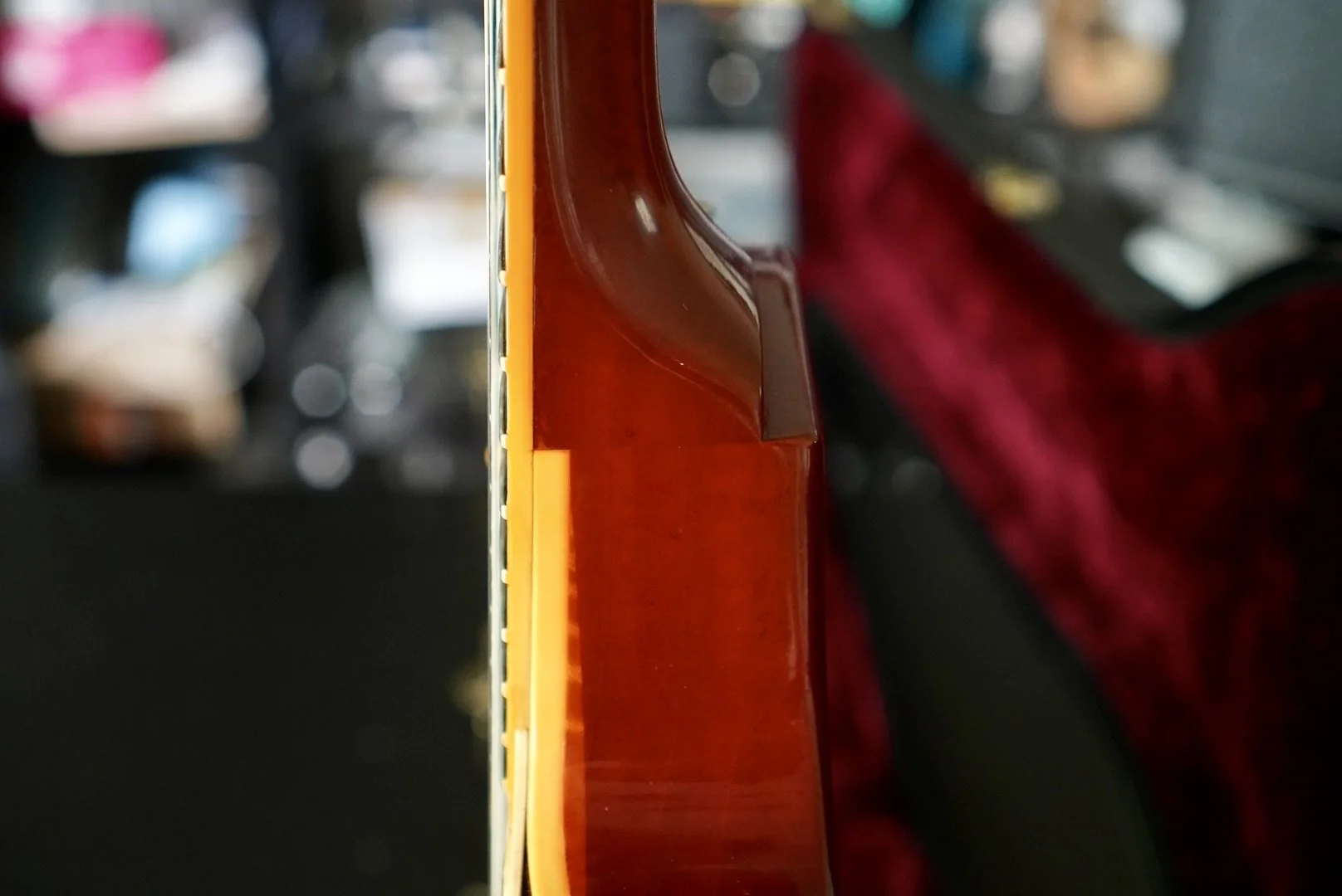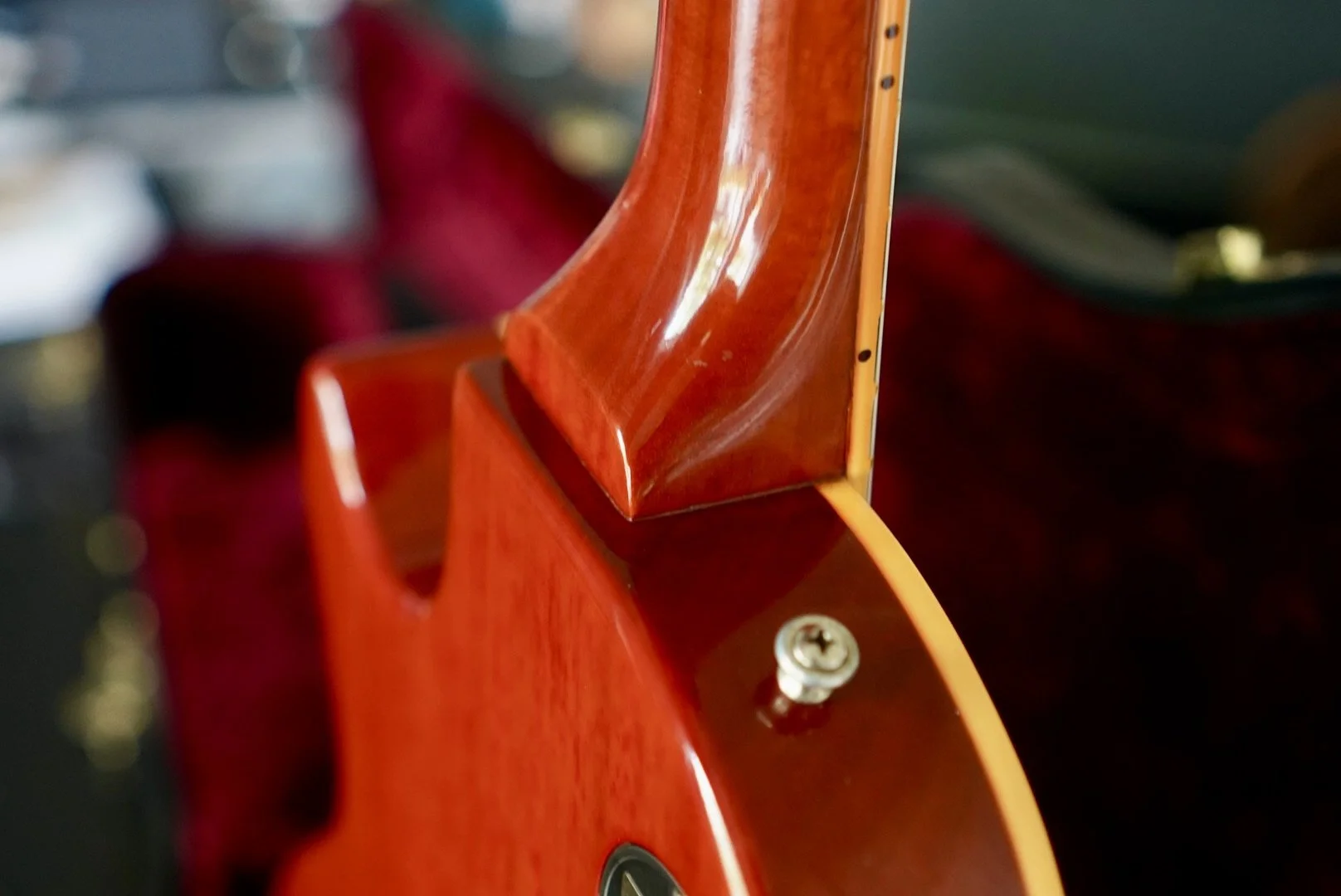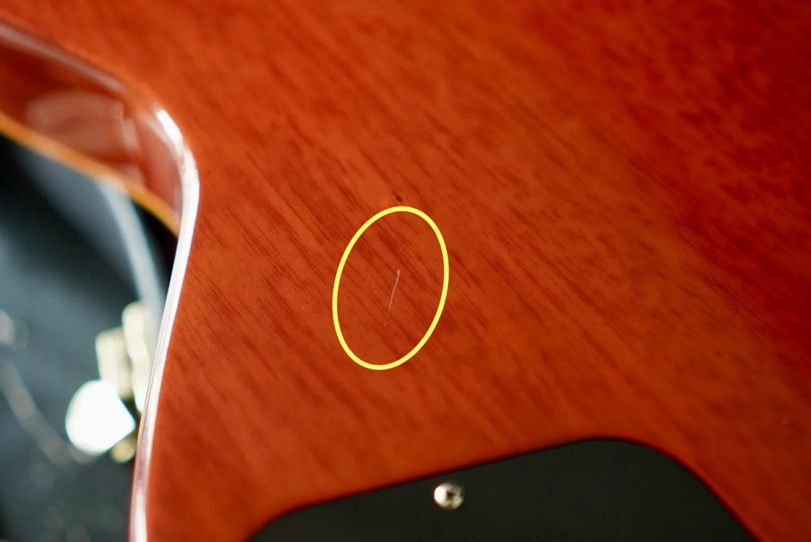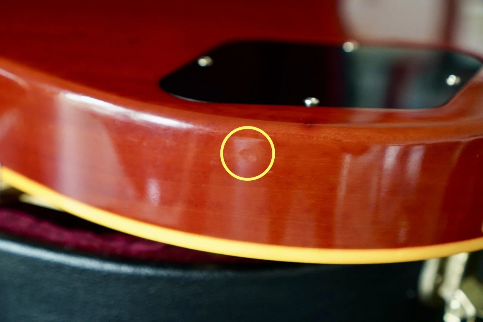 She’s in EXCELLENT CONDITION with very minor cosmetic signs of use. One small scratch by the Tone Cavity, a small impression on the underside, and a small imperfection on the guard is all I can find.