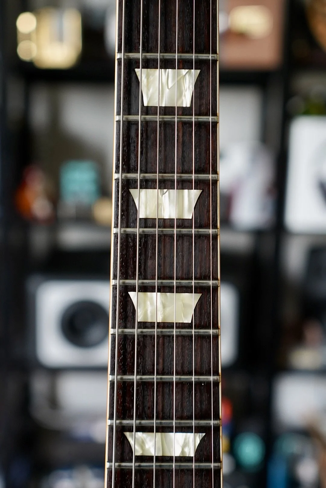 Frets have tons of life. Action is low and the neck is straight. She’s real fun to play all the way up the neck.