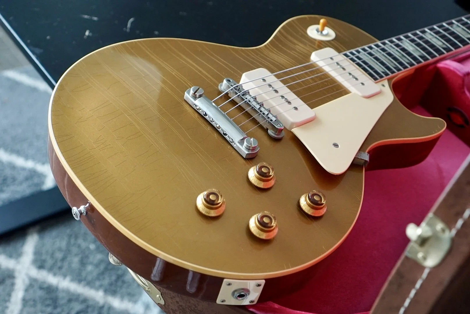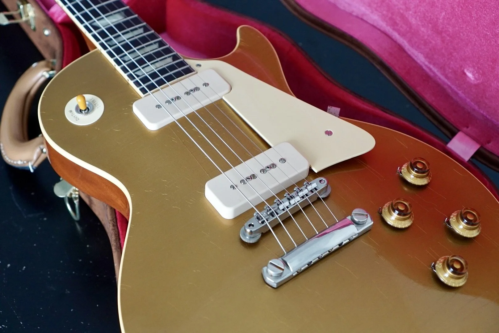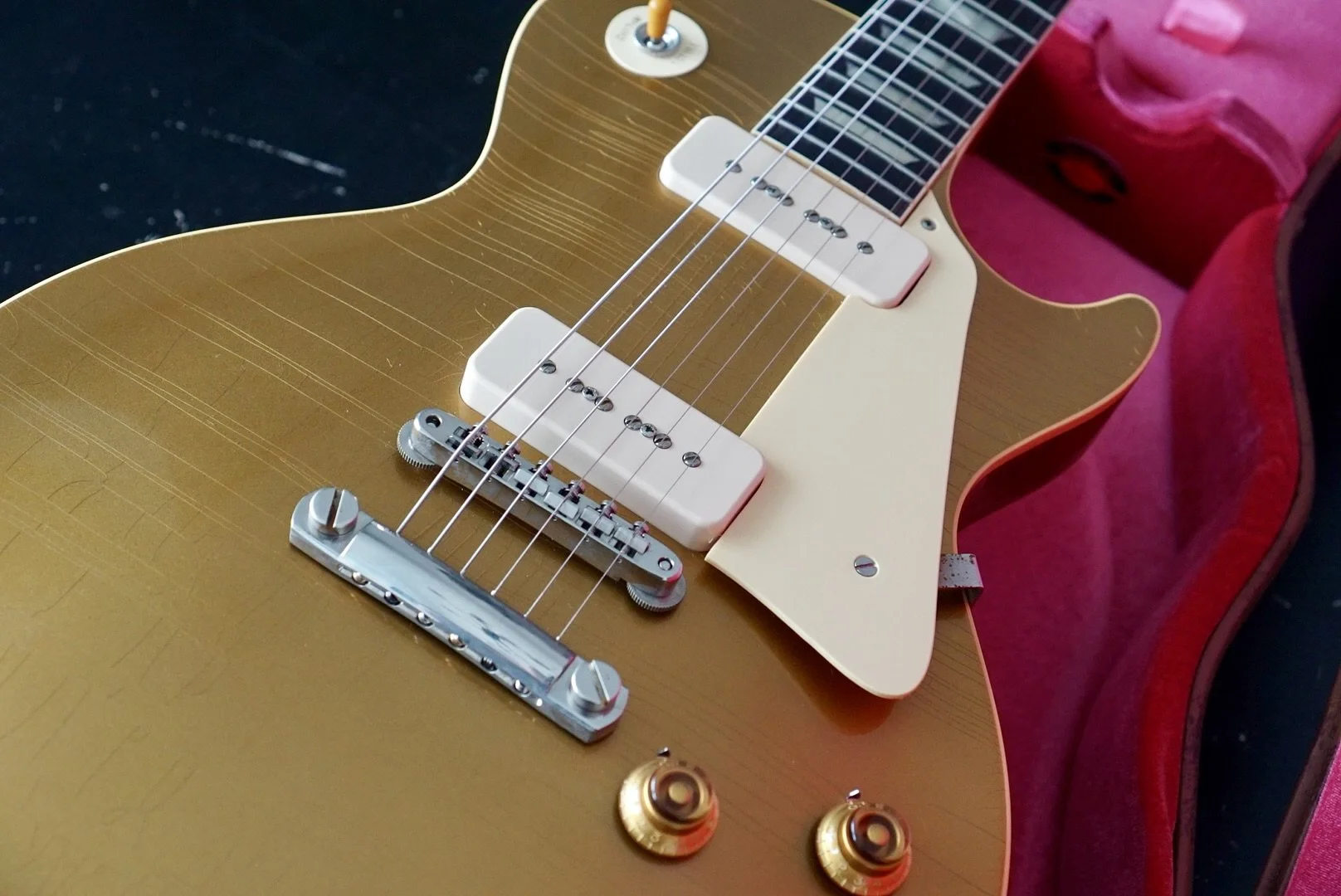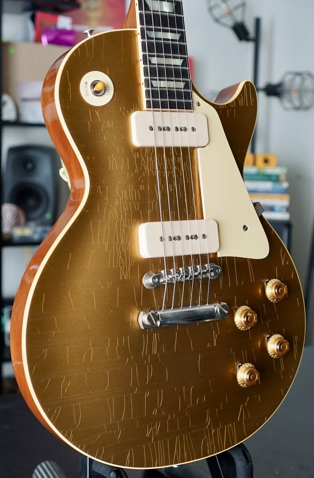 The stock P90s are responsive and articulate. She is bright and smooth on the bridge pickup and warm and clear on the neck.