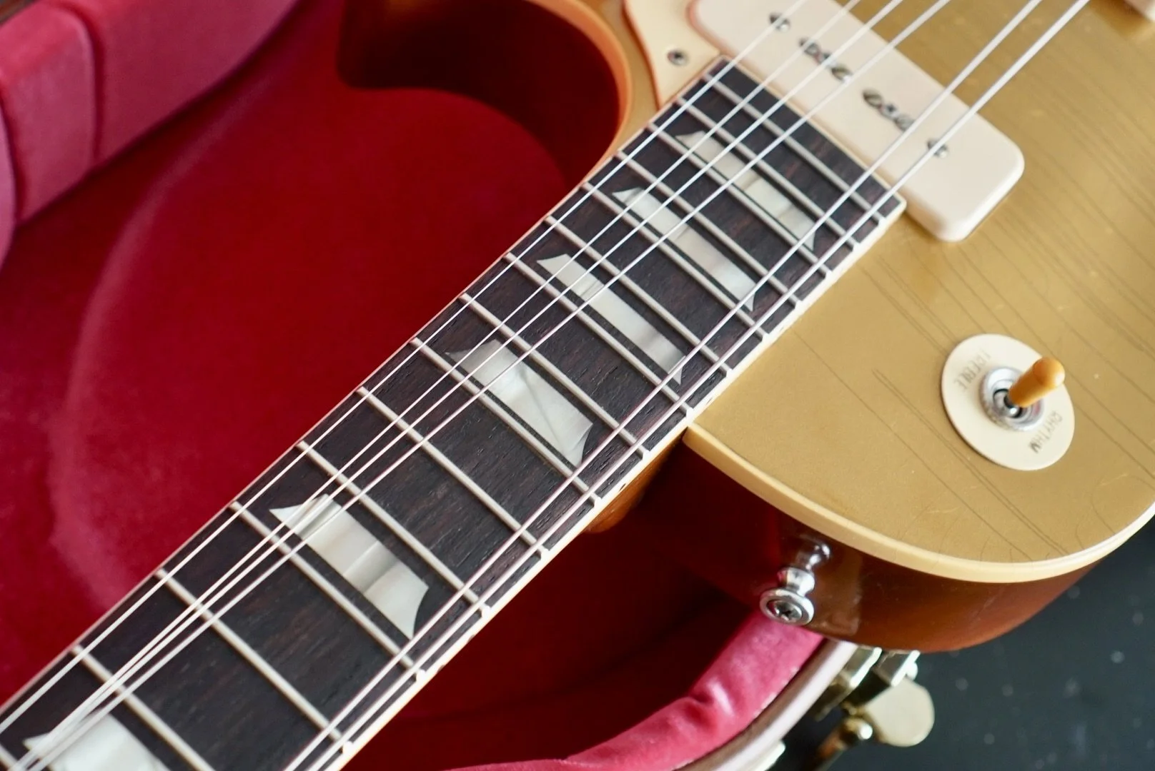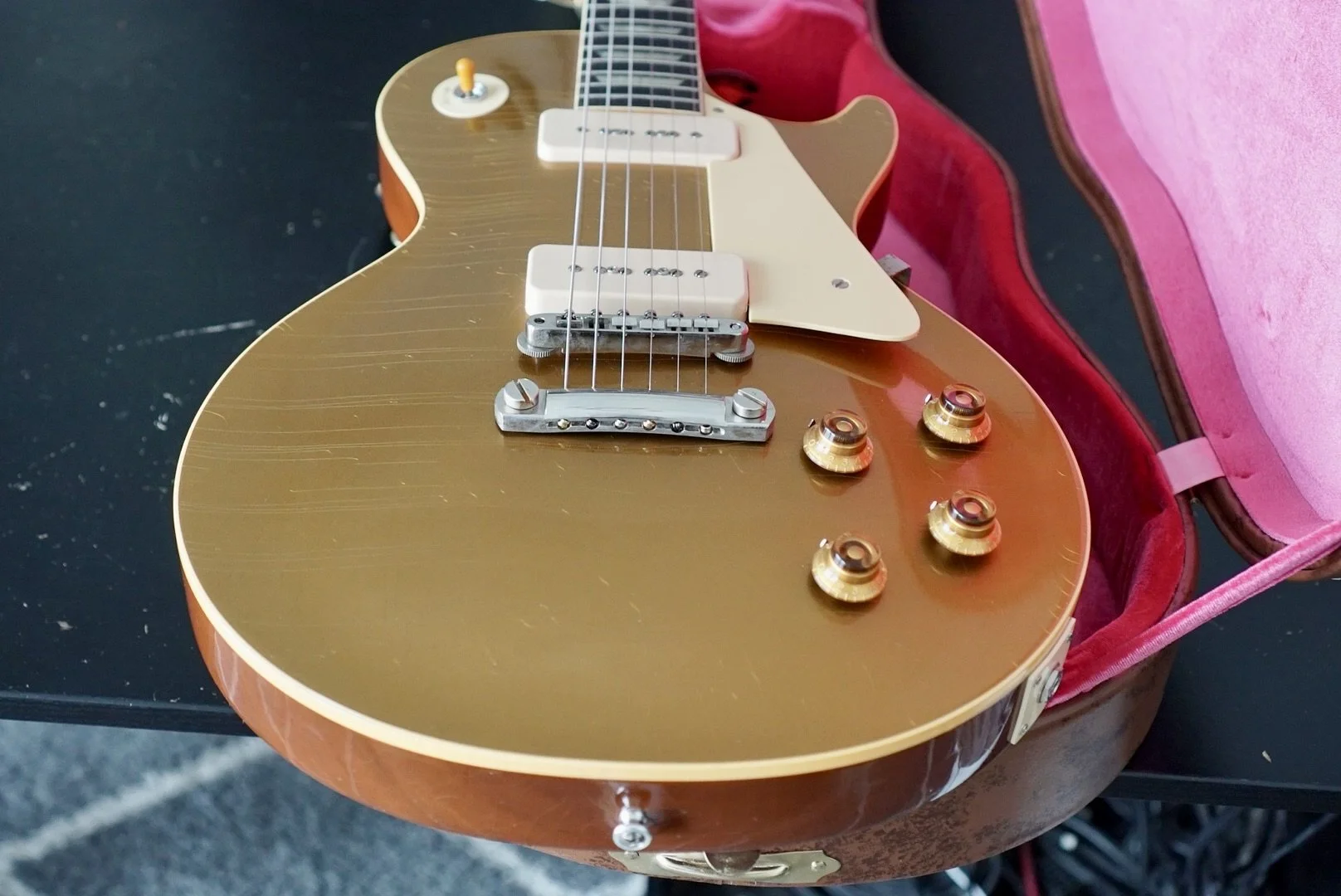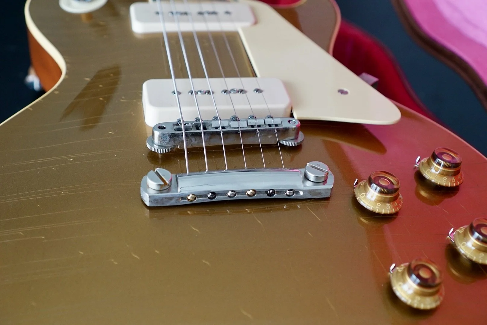 The stock P90s are responsive and articulate. She is bright and smooth on the bridge pickup and warm and clear on the neck.