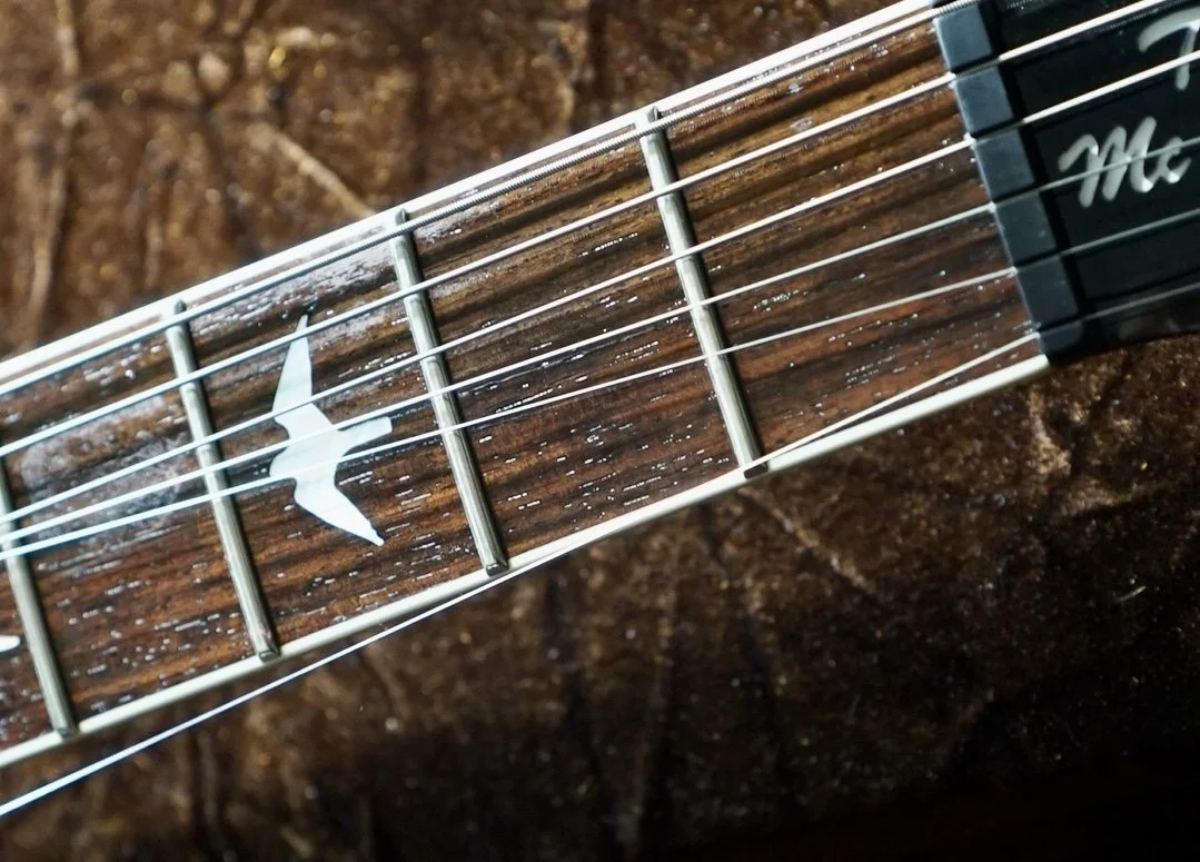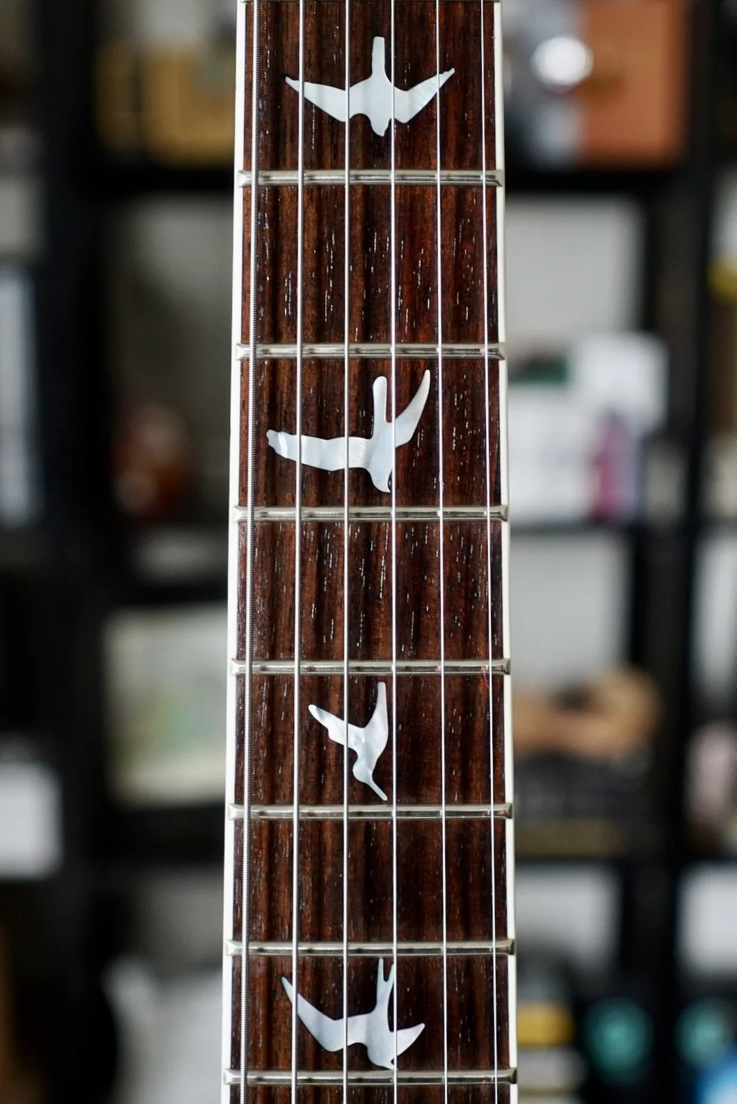 Ridiculously cool Flamed Painted Headstock looks just fantastic!! The Rosewood Fretboard is dark and warm and crowned with those Pearl Bird Inlays she really is unmatched!