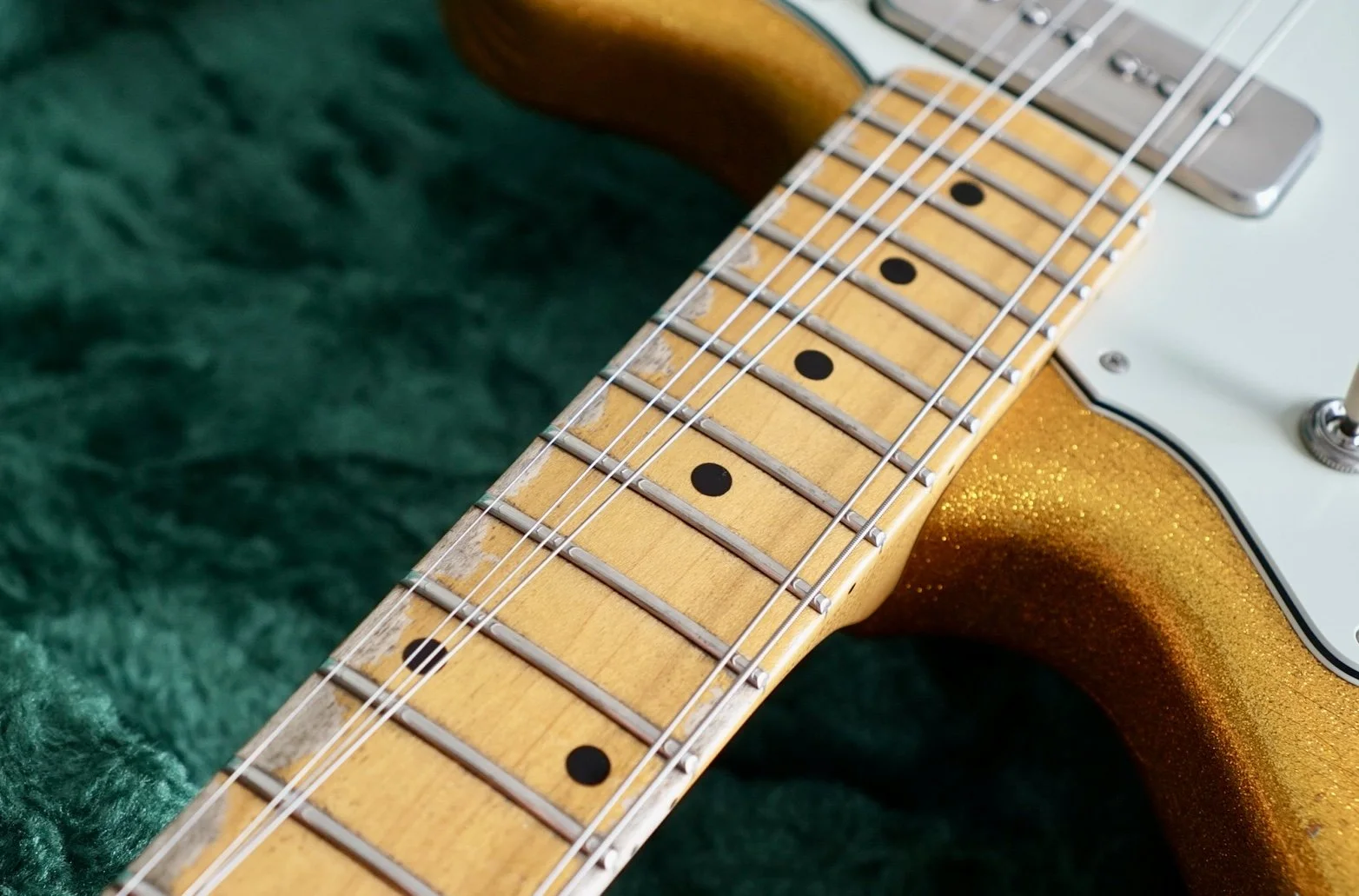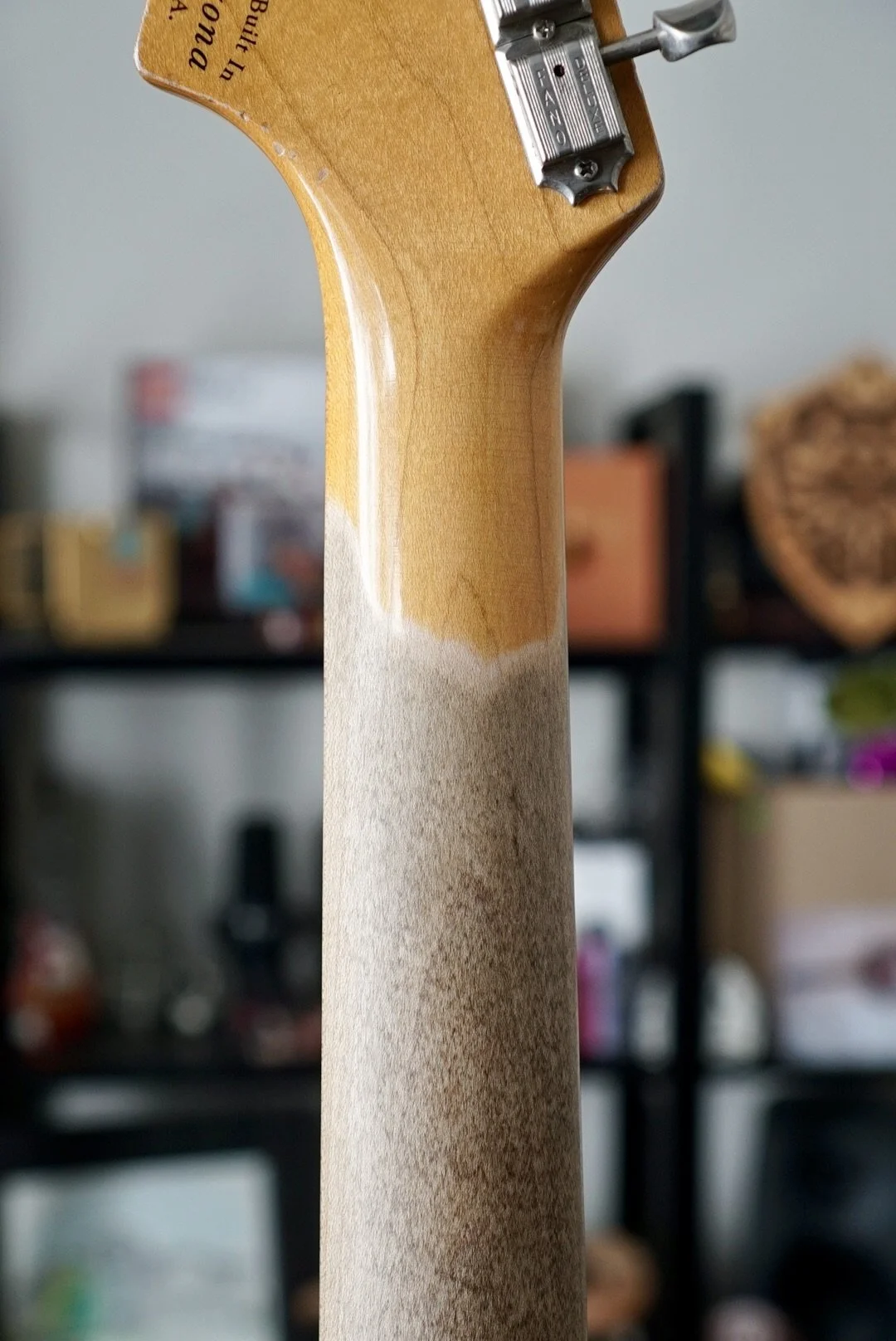 The maple fretboard is comfortable on that early ‘60s-inspired C profile and the frets show virtually no wear. Action is low and she is set up nicely by Dr. Jon in Austin, Texas. Neck is thin and easy to play.