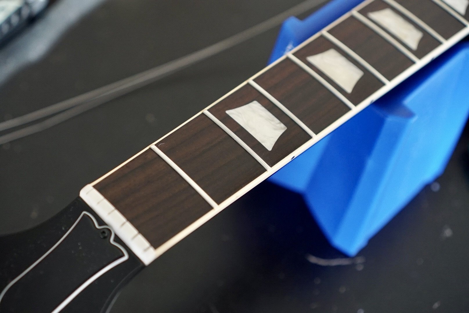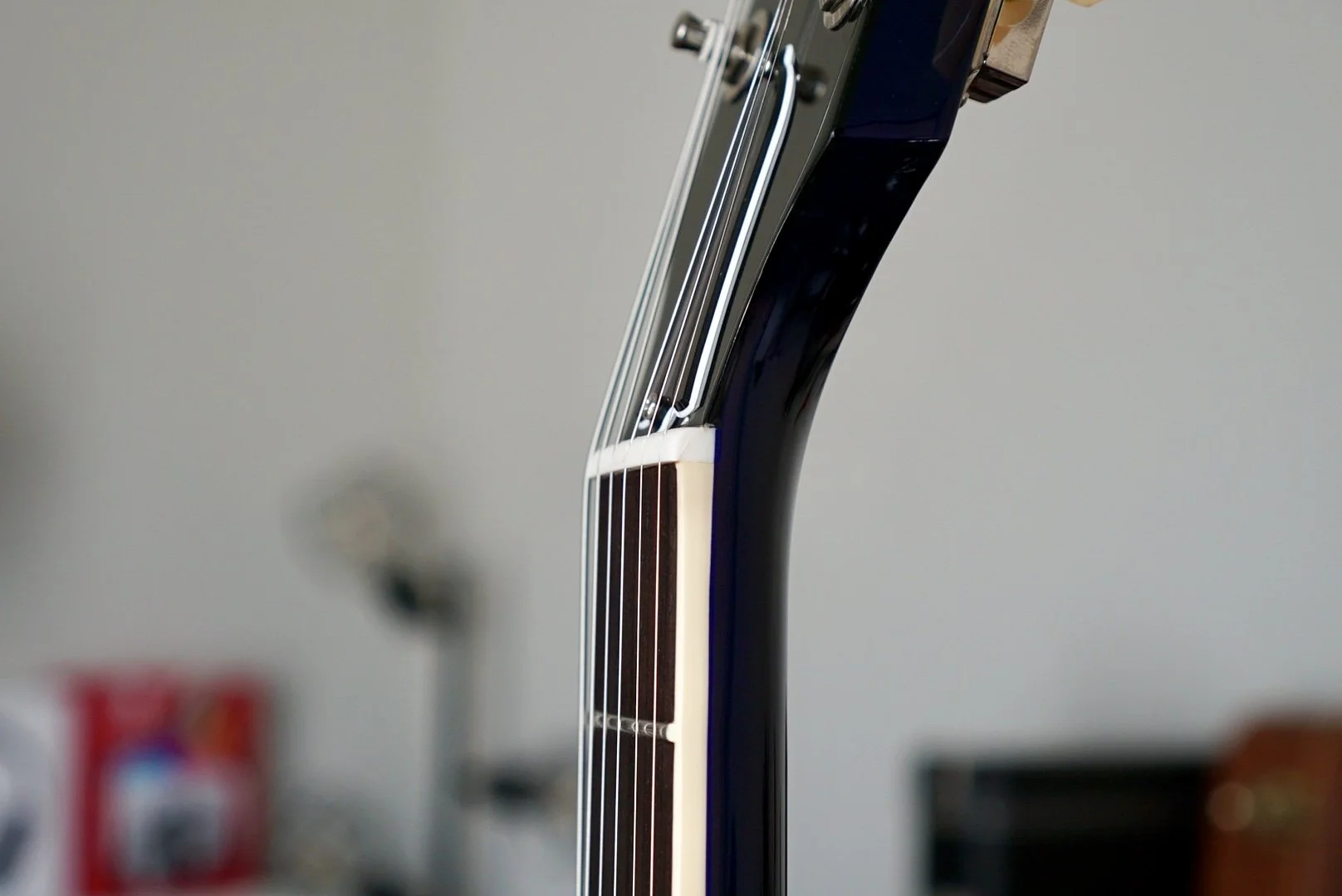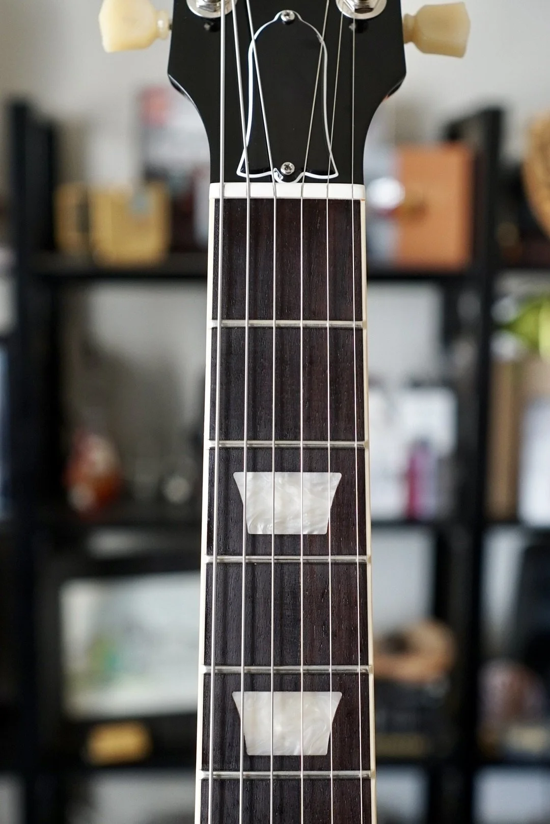 Neck is fat 50s style, straight as an arrow, and action is nice and low right now. Electronics are smooth and quiet! .87 on first fret and .96 on the twelfth.