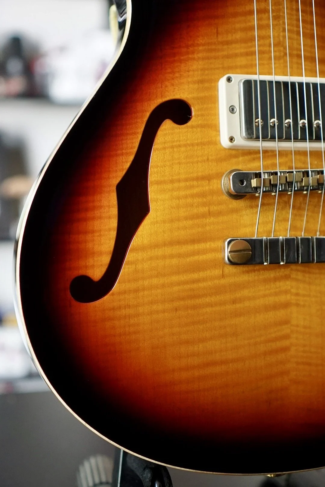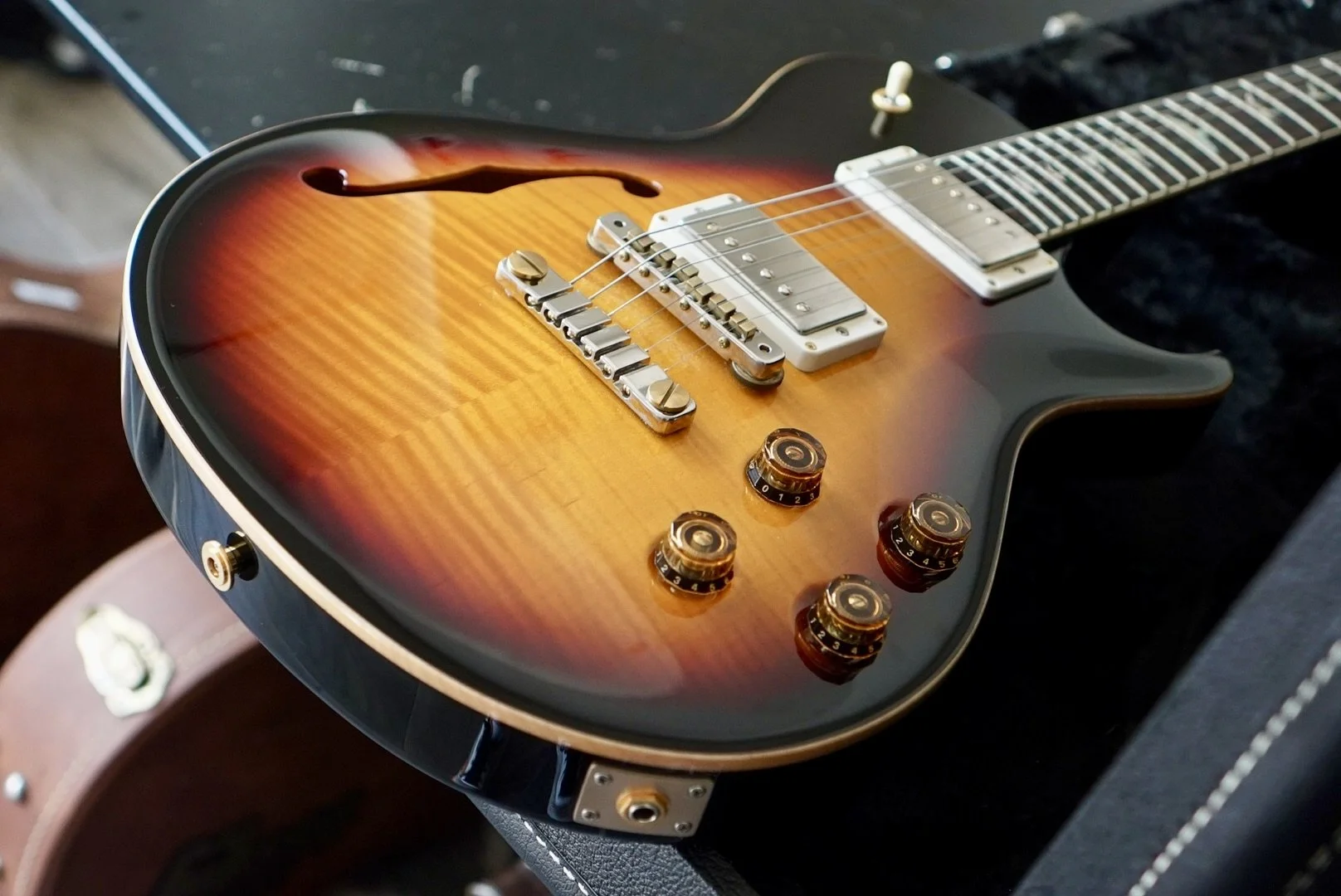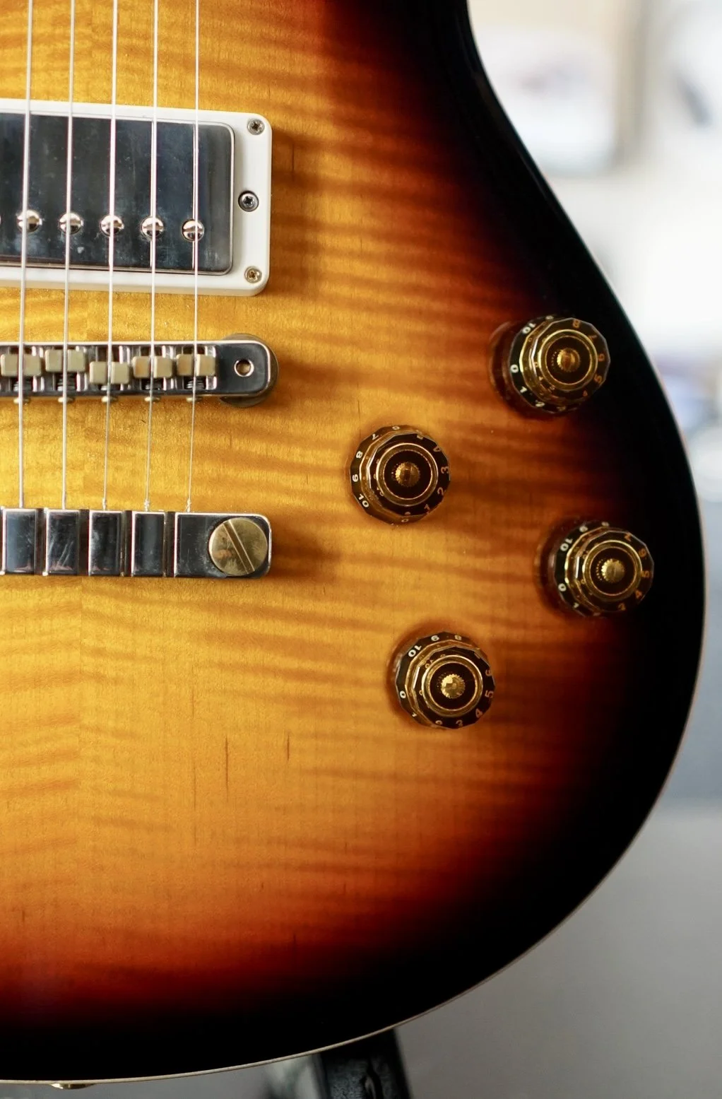Absolutely stunning FLAME FOR DAYS Top. This Spray/Flamed Maple Top of McCarty Sunburst will be hard to rival. The flamed creme binding is just the cherry on top!