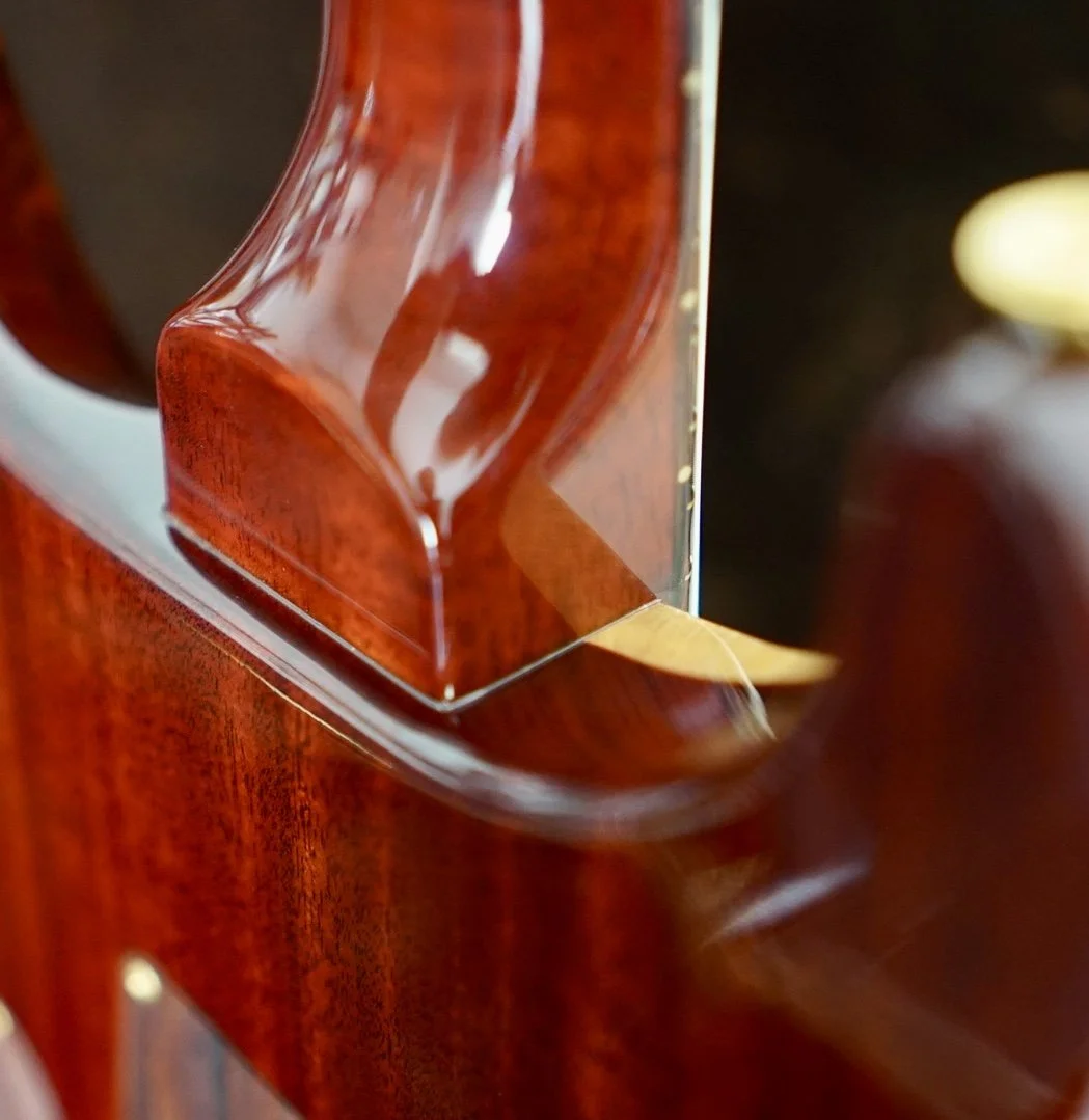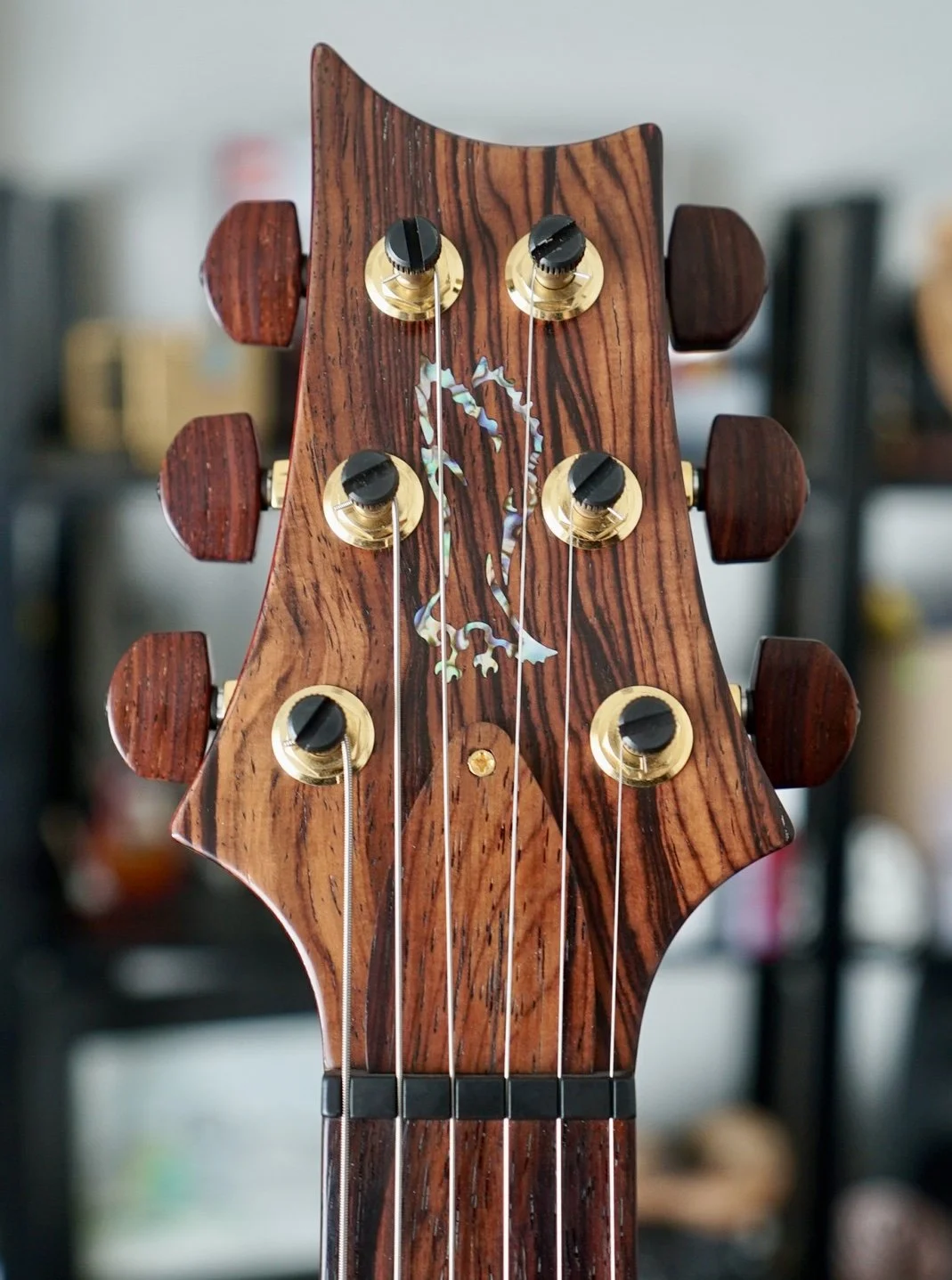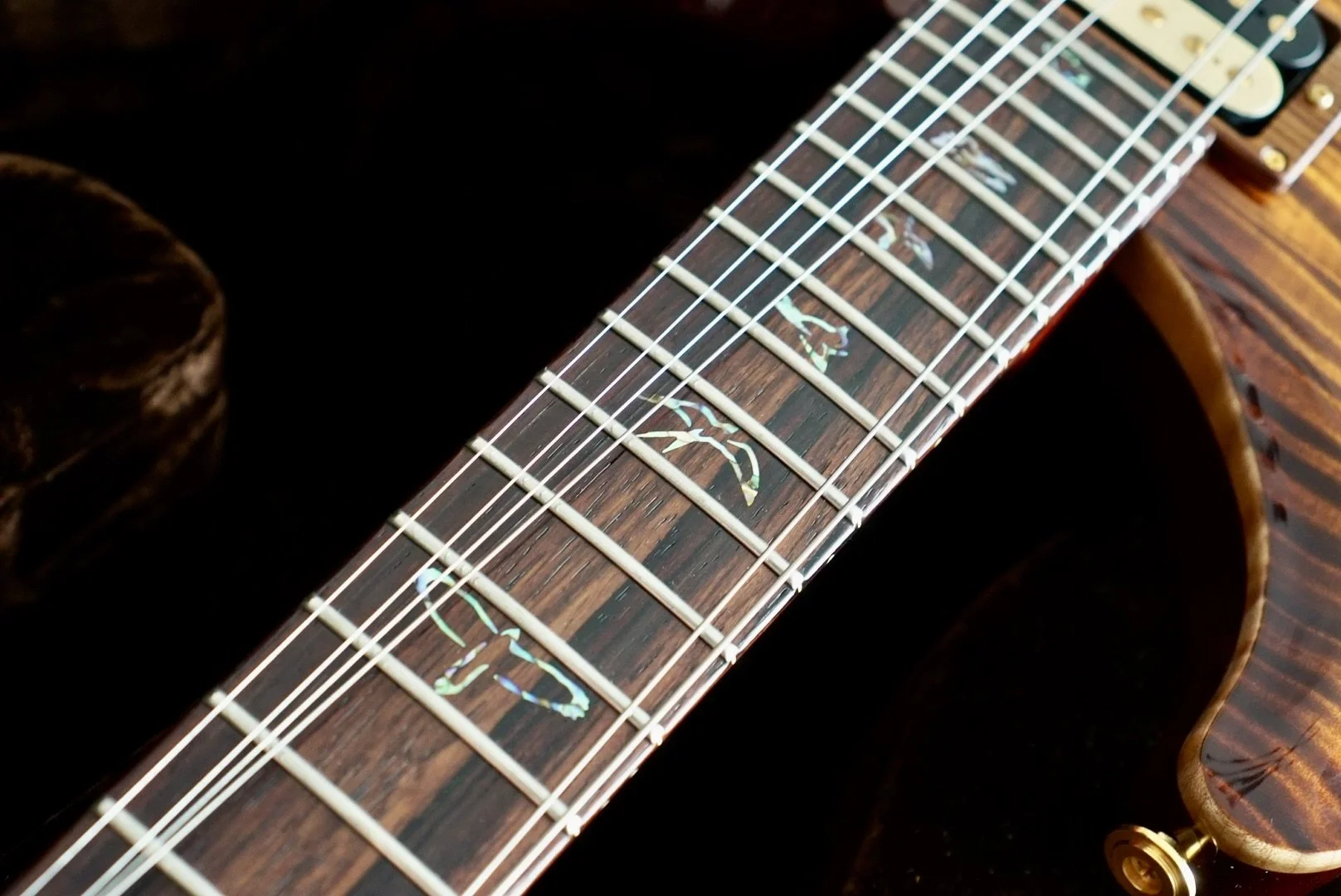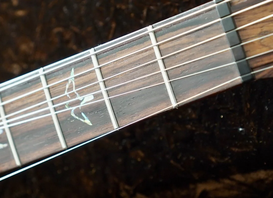 Ridiculously cool Ribbon Striped Mahogany Back and Neck!! The Cocobolo Board and Headstock Veneer is dark and warm and crowned with those Paua J Eagle Inlays and Headstock Logo. She really is unmatched!
