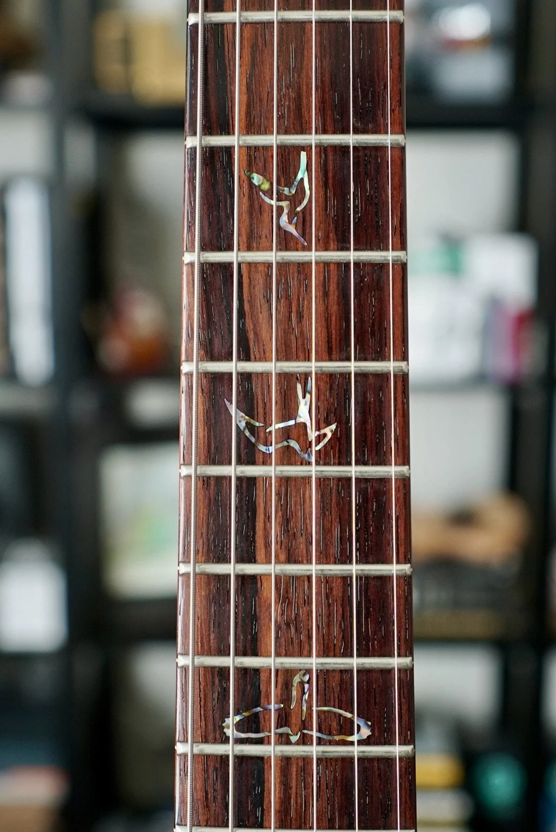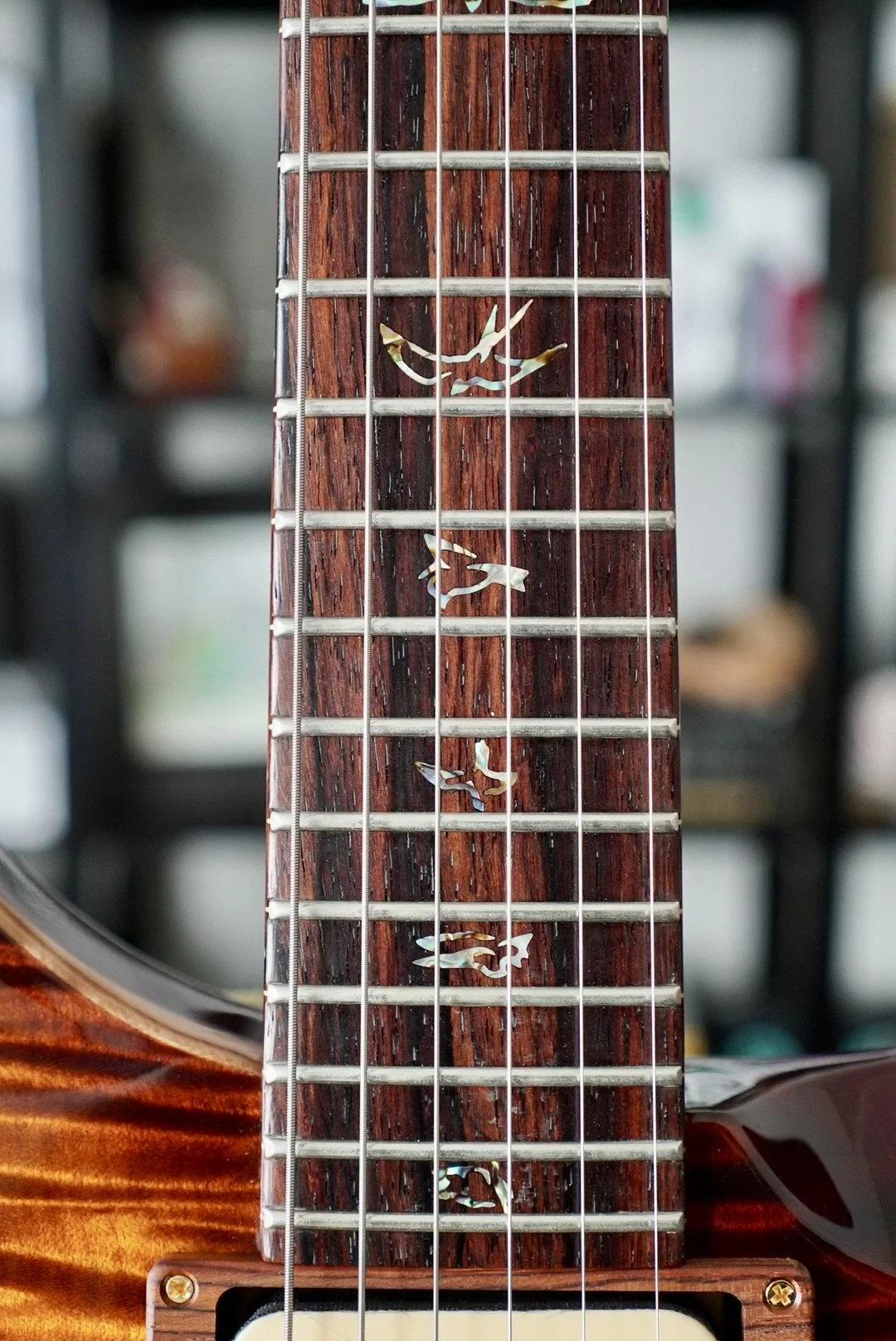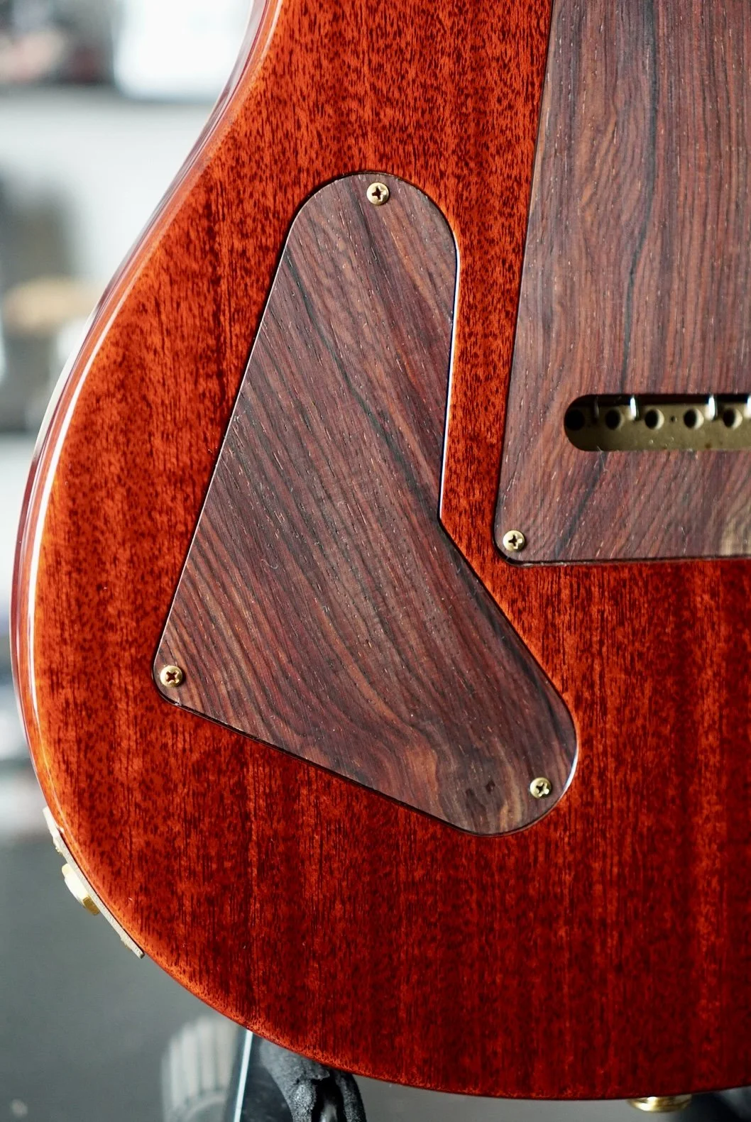 Ridiculously cool Ribbon Striped Mahogany Back and Neck!! The Cocobolo Board and Headstock Veneer is dark and warm and crowned with those Paua J Eagle Inlays and Headstock Logo. She really is unmatched!